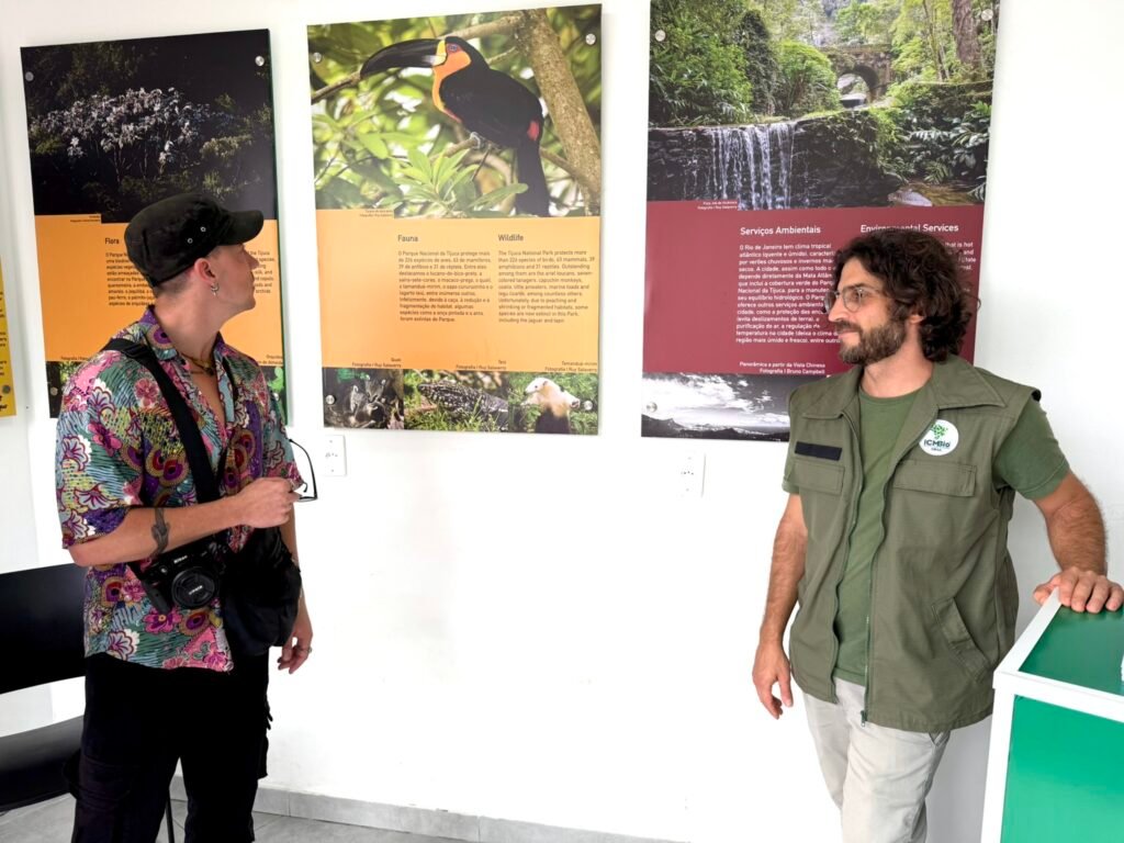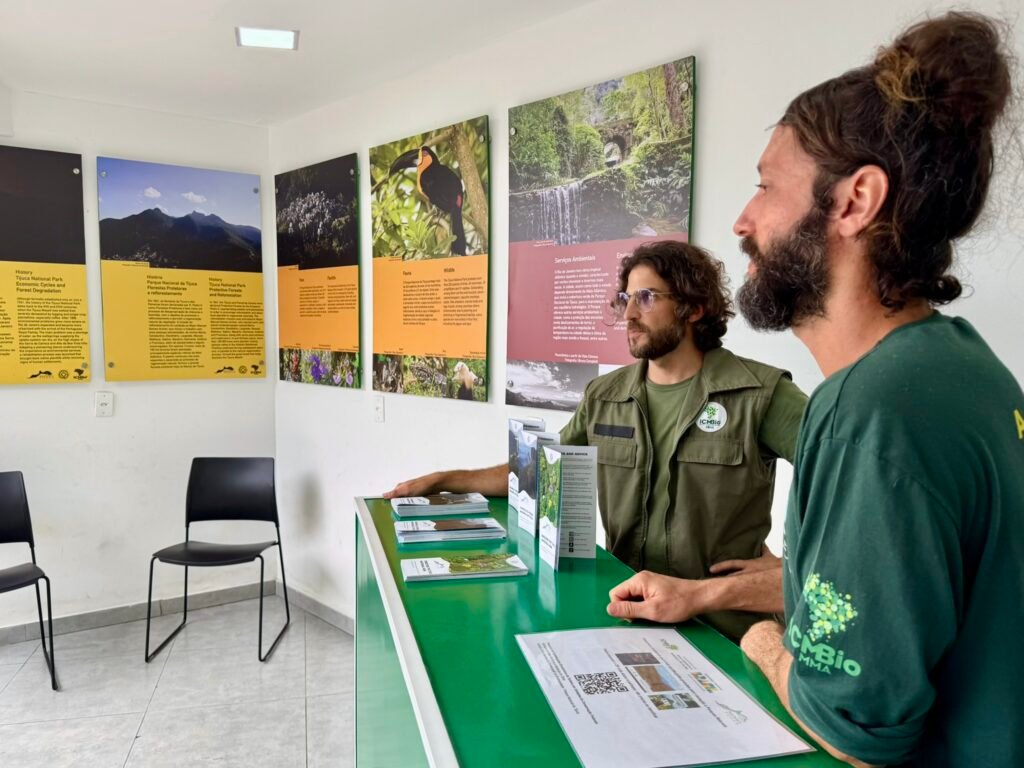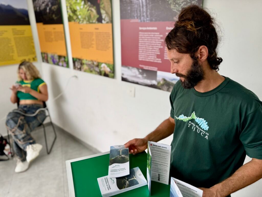 Dois servidores do ICMBio fazem o atendimento bilíngue (português e inglês) ao público dentro do horário de visitação do Alto Corcovado.