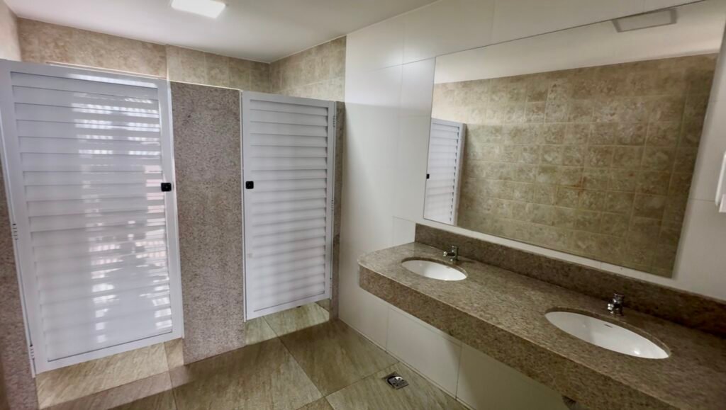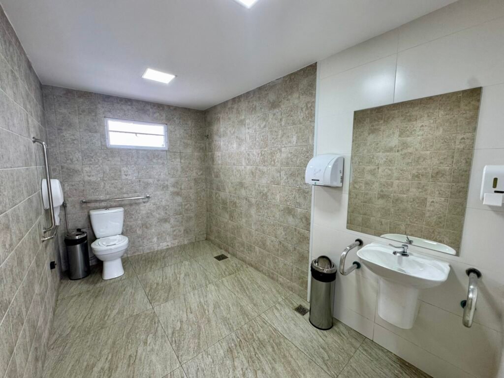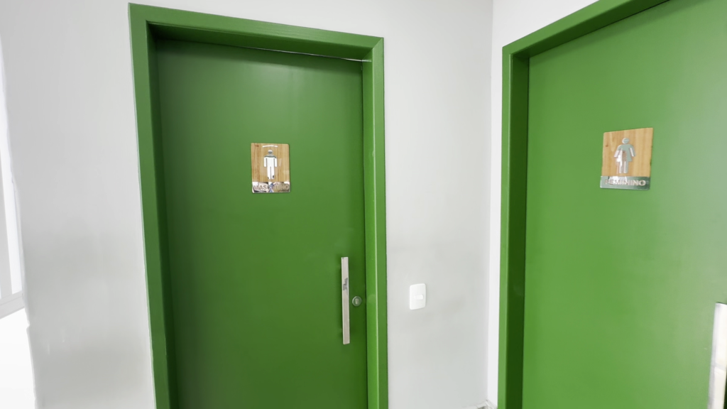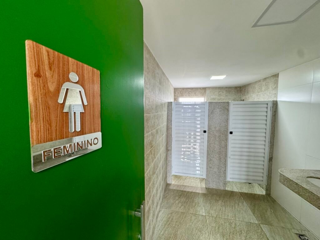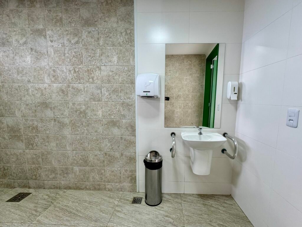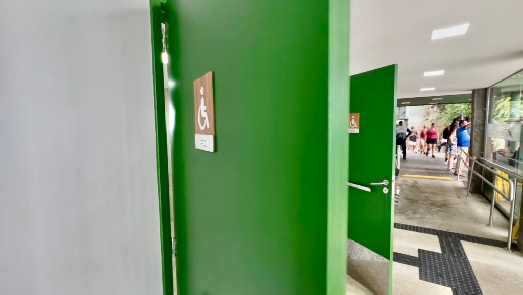 No total, são dois banheiros totalmente adaptados para PcD que seguem a NBR 9050 da ABNT, além de um banheiro feminino e outro masculino de uso geral. Dentro dos sanitários acessíveis, foram instaladas barras de apoio nos lavatórios e nos vasos, assim como um botão de alarme para acionamento em caso de emergência. O piso dos banheiros é antiderrapante e as torneiras das pias possuem uma alavanca maciça e maior que auxilia o acionamento por PcD.