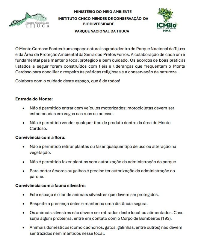 É importante observar que, atualmente, o trecho da trilha do Rio Carioca que está aberto vai do Centro de Visitantes das Paineiras até o Mirante da Guanabara. Já o trecho tanto de descida quanto de subida entre o o reservatório da Mãe D'Água e o Mirante da Guanabara ainda será submetido a intervenções e, por isso, neste momento ele não está aberto para o trânsito de alunos ou visitantes . Dessa forma, reforçamos que as visitas devem respeitar o trajeto tanto de ida quanto de volta apenas entre o Centro de Visitantes das Paineiras e o Mirante da Guanabara.