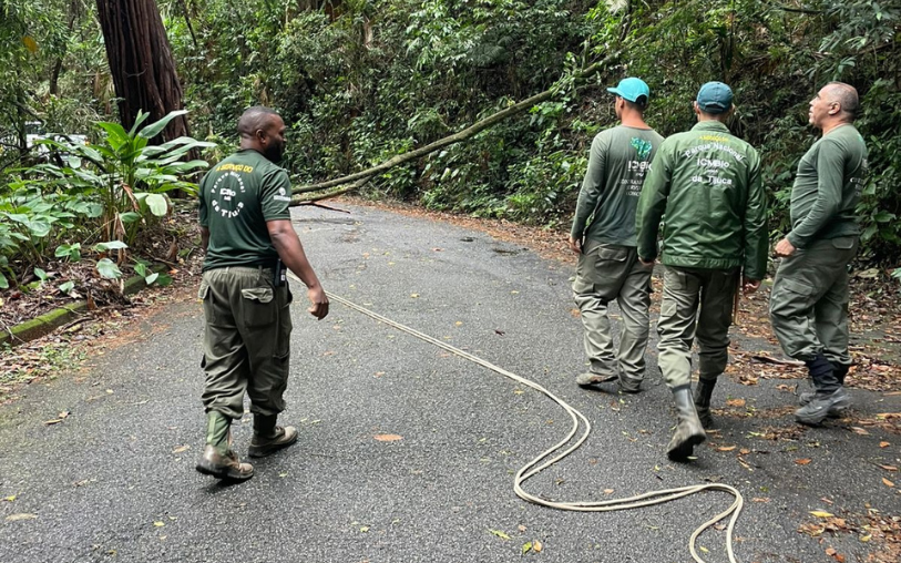 Também foram identificados e removidos galhos de árvores que estavam comprometidos no Largo do Bom Retiro, mas que ainda não haviam se desprendido das árvores. Este local, por exemplo, é onde se iniciam algumas das trilhas mais procuradas deste setor, como o Pico da Tijuca e o Pico do Bico do Papagaio.