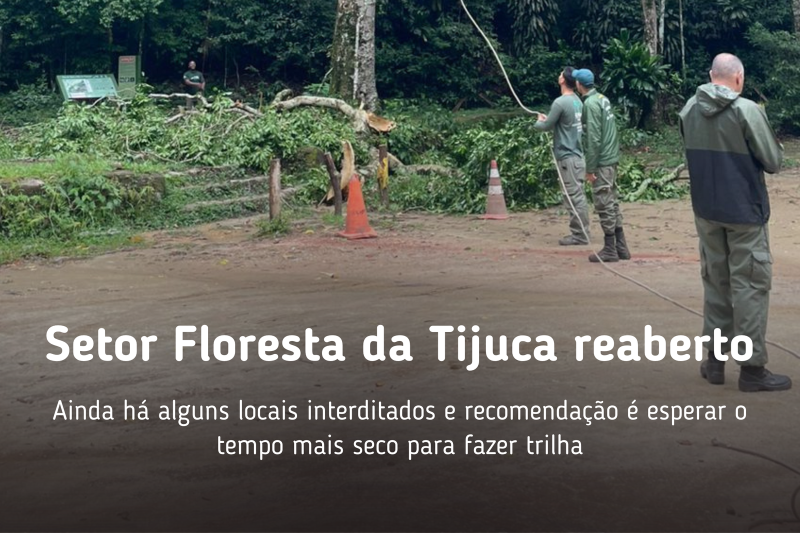 O Parque Nacional da Tijuca informa que o setor Floresta da Tijuca foi reaberto para a visitação pública no início da tarde desta segunda-feira (05/01/2026). A liberação foi possível após a desobstrução de vias internas onde havia árvores caídas e a retirada de rejeitos arrastados pela chuva intensa deste domingo (04/01/2026).